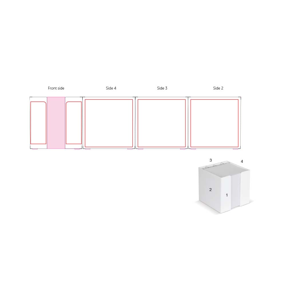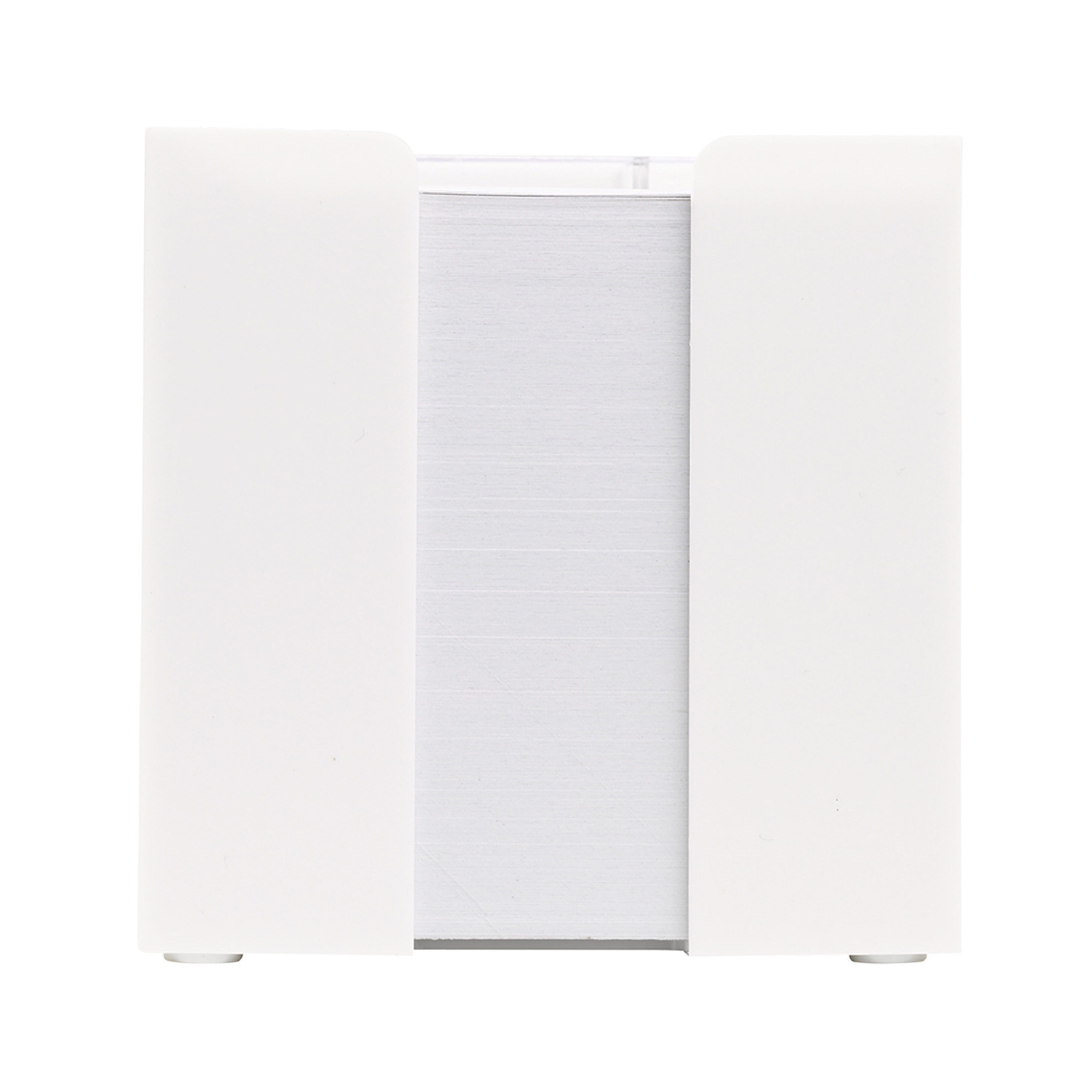 Auffallende Zettelbox mit vier transparenten Köchern für diverse Büroartikel. Weißes Papier, ca. 800 holzfreie Blätter. Einzeln eingeschweißt. 90g/m².