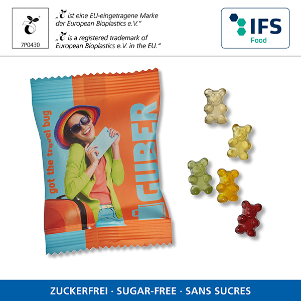 Zuckerfreie Bärchen in kompostierbarem Werbetütchen