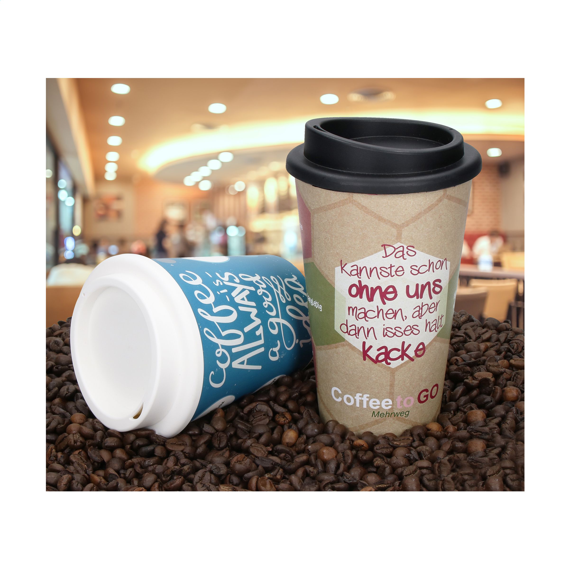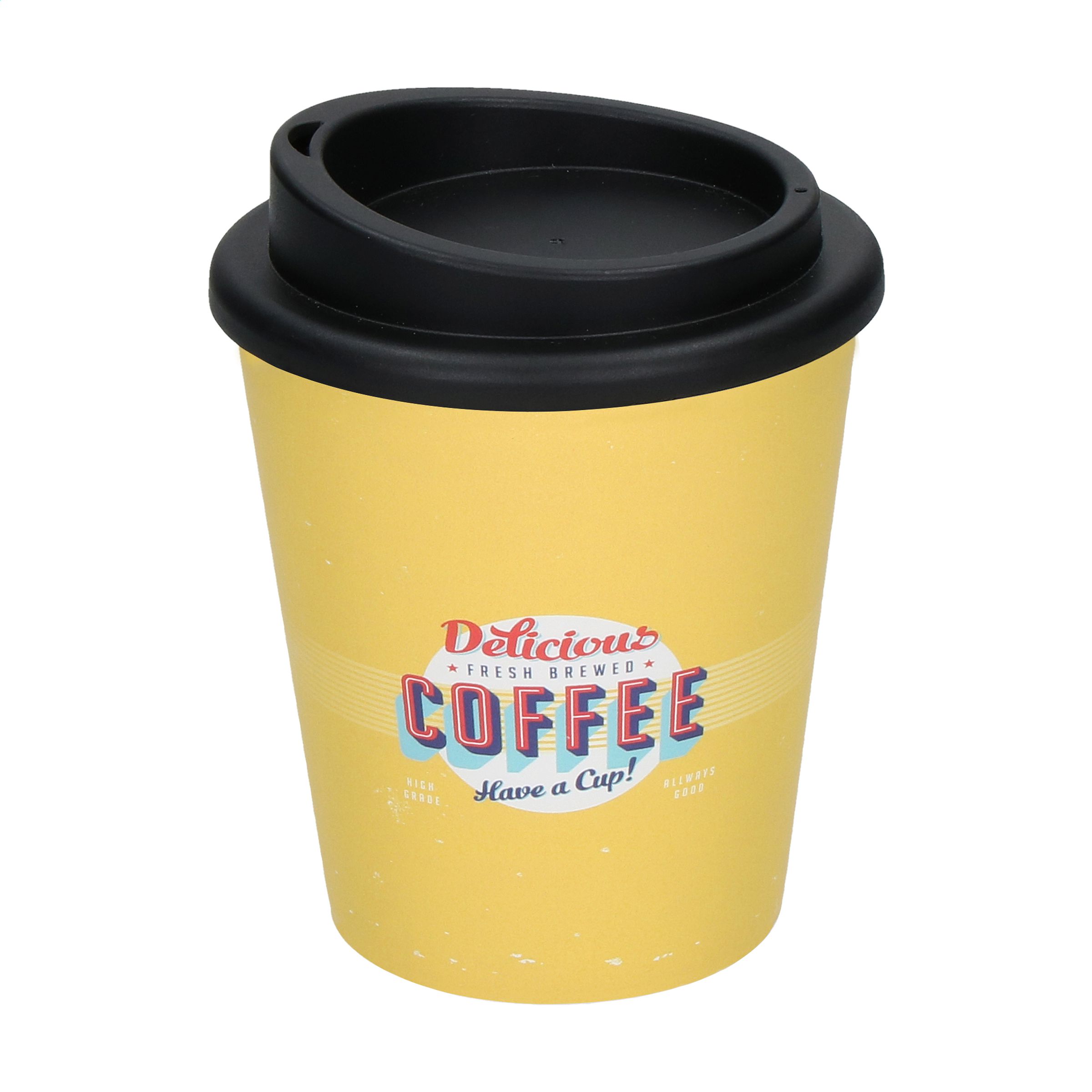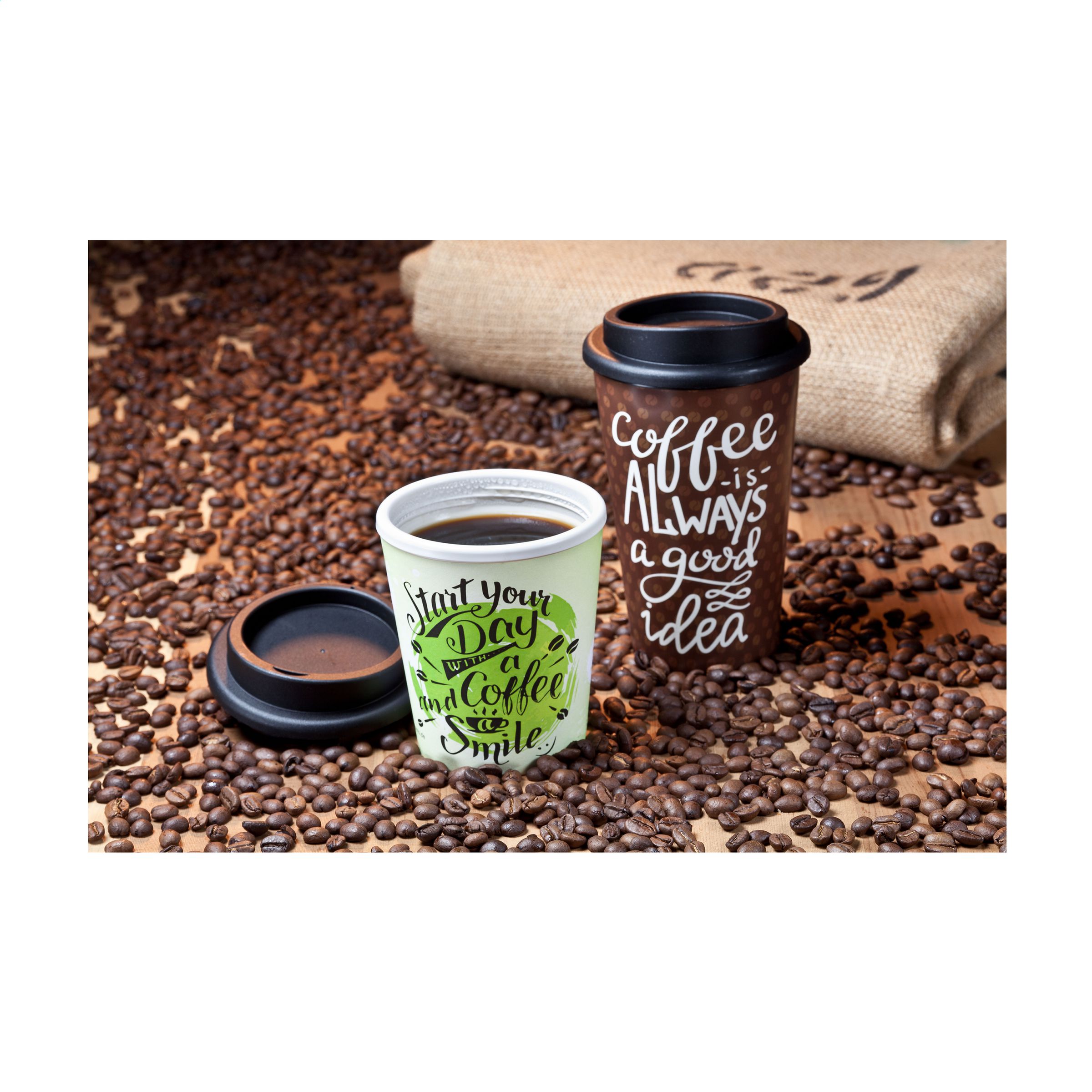Doppelwandiger Coffee-To-Go-Becher aus BPA-freiem Kunststoff. Praktisches Modell mit Schraubdeckel, ausgestattet mit Trinköffnung. Passt in den Standard-Trinkbehälter von Autos, was praktisch für unterwegs ist. Wiederverwendbar. BPA-frei und geeignet für Levensmittel. Fassungsvermögen 250 ml. Made in Germany. Die Oberfläche eignet sich ideal für den iMould-Vierfarben-Aufdruck (wasser-, kratz-, farb- und UV-beständig) in jedem gewünschten Design. Mindestbestellmenge pro Farbe 500 Stück.