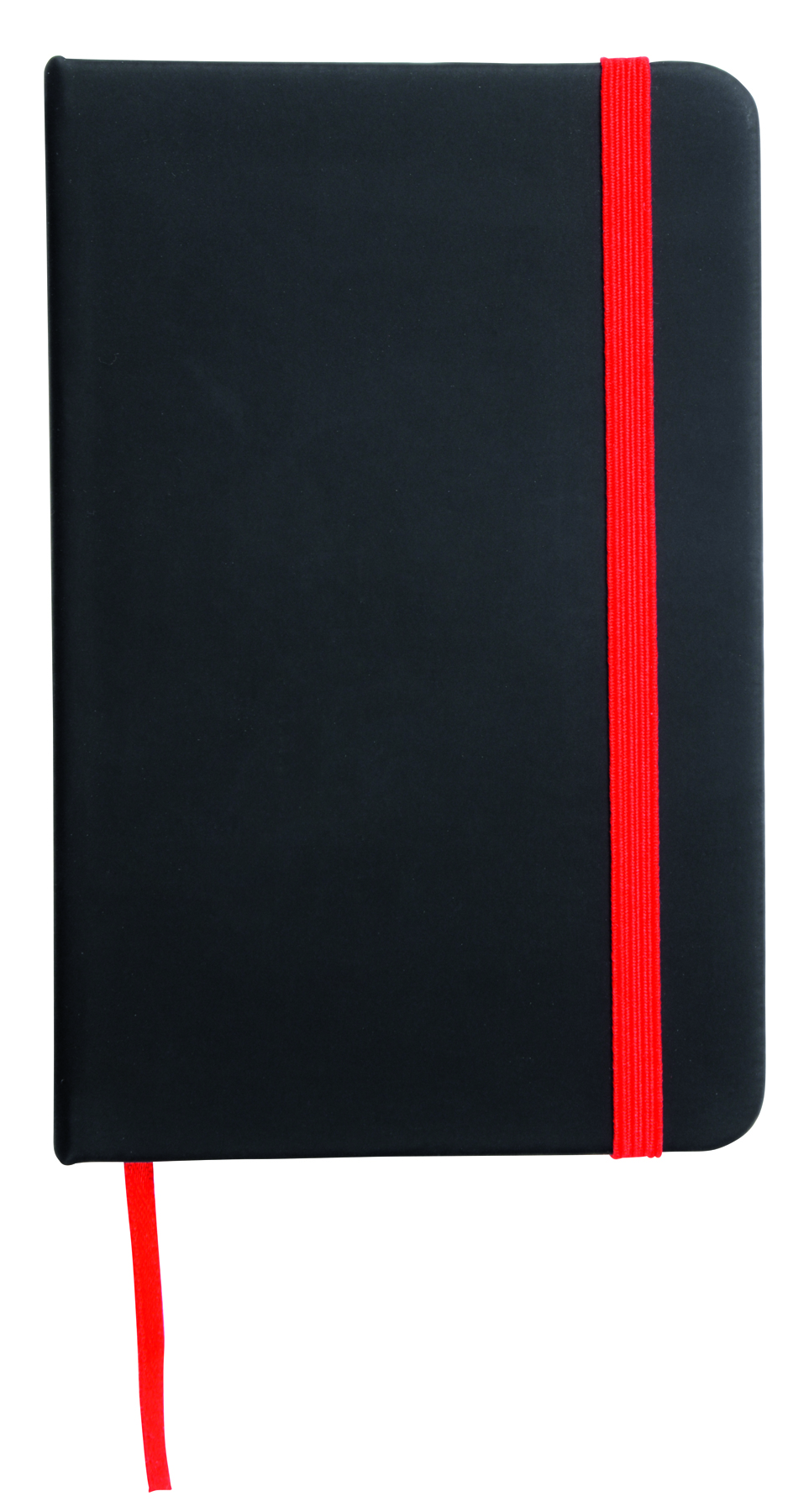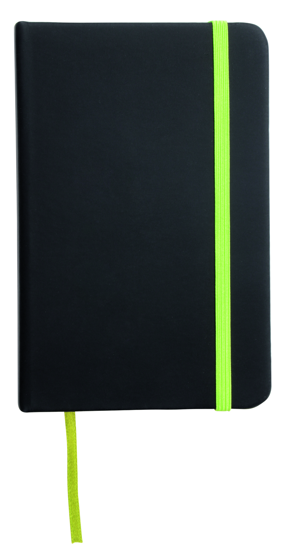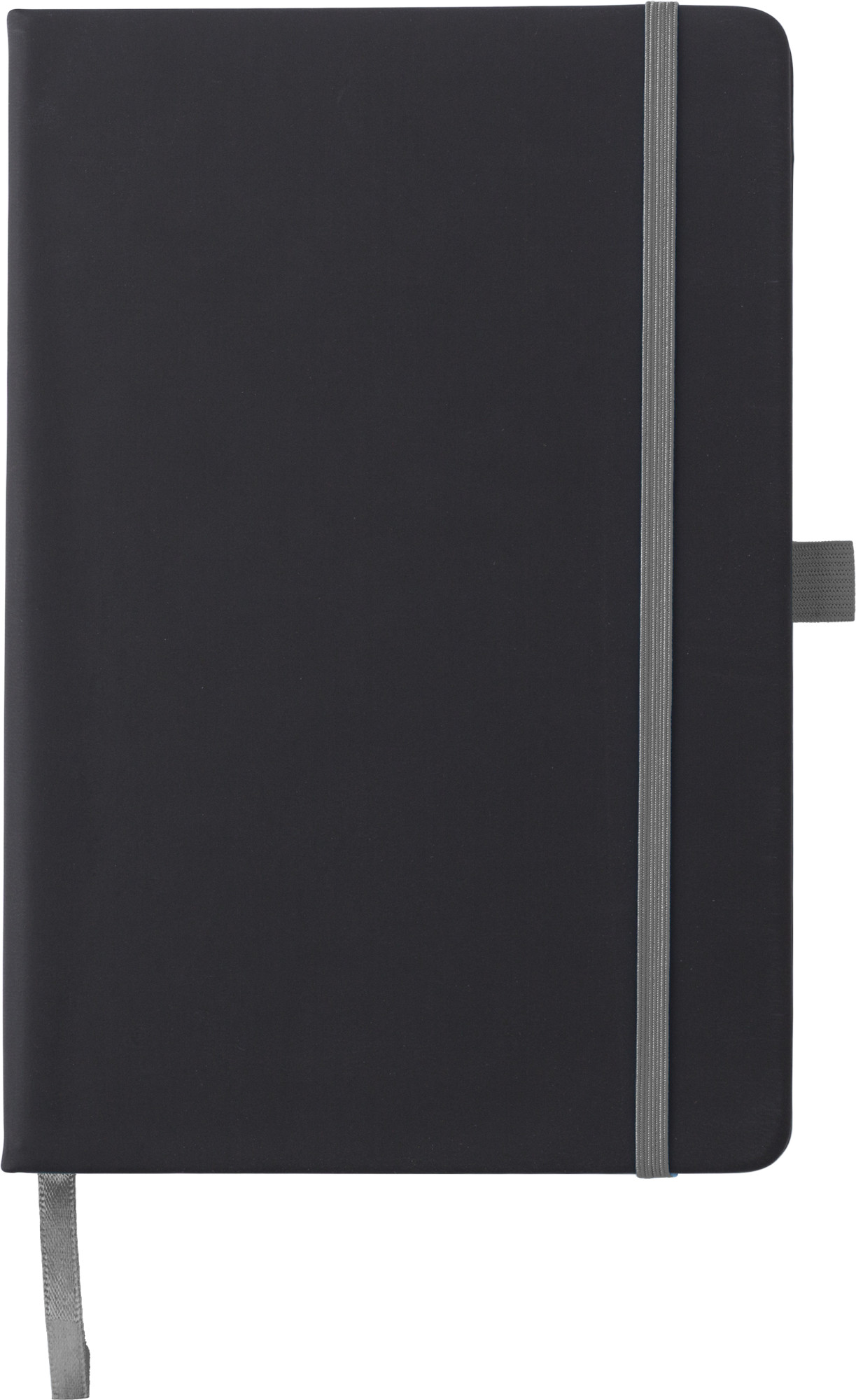 Notizbuch aus PU mit 96 linierten Seiten und einem Cover, welches mit einem Gummiband verschlossen wird. Wenn das Cover gelasert wird, hat das Logo die gleiche Farbe wie das Gummiband.