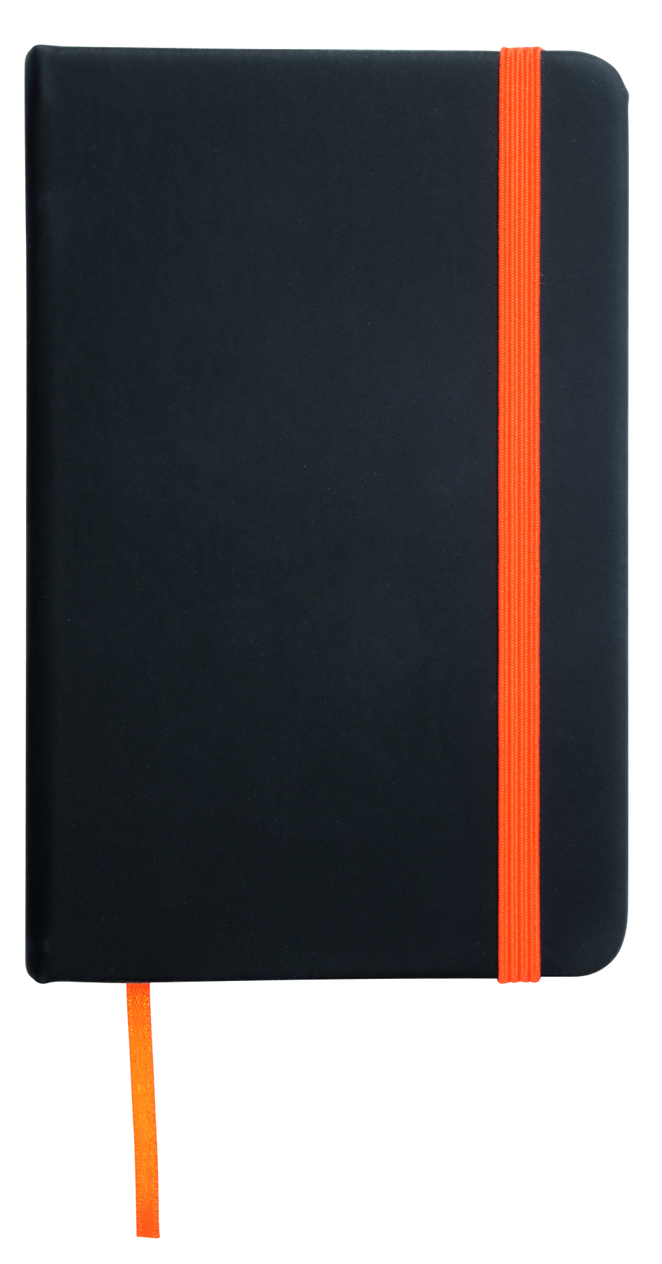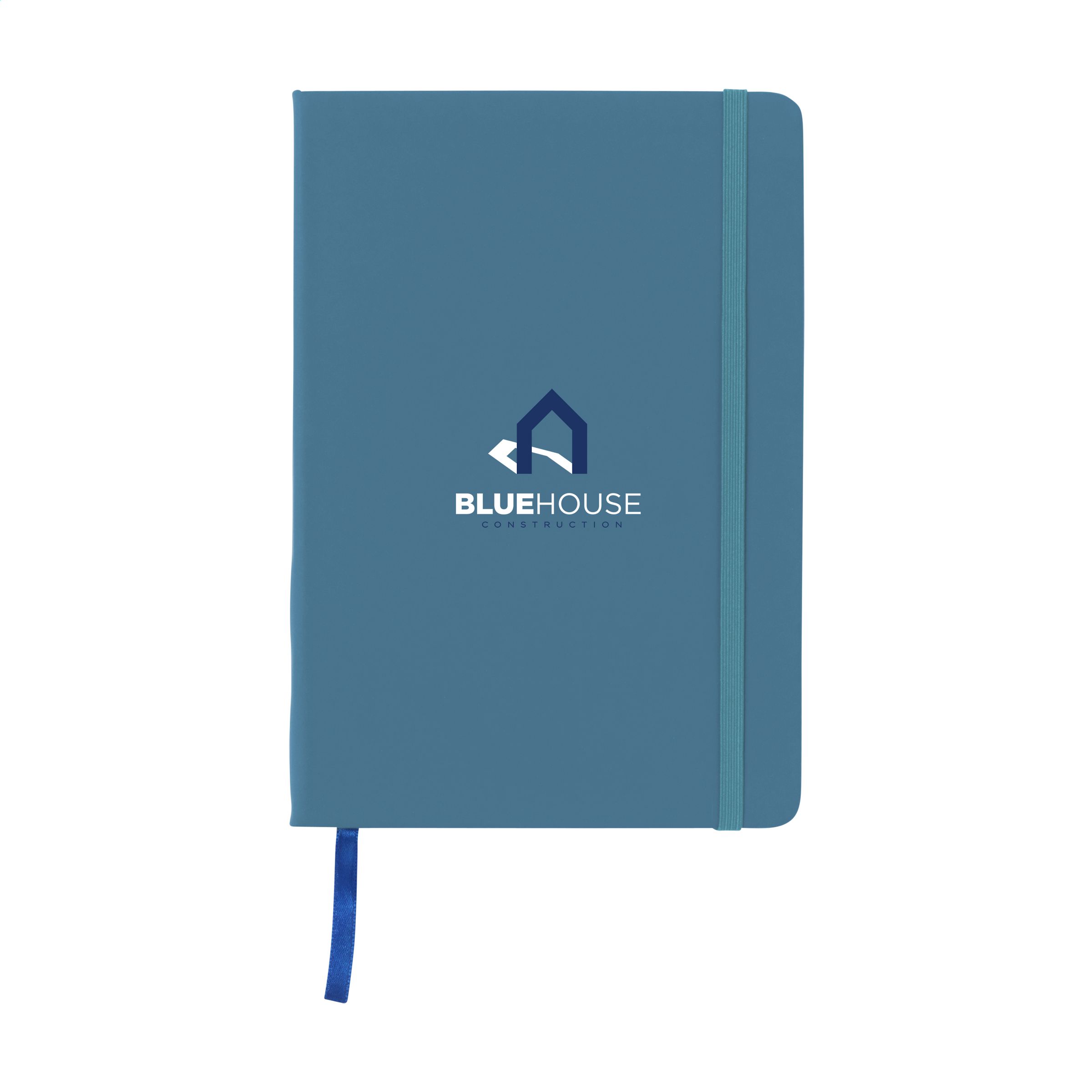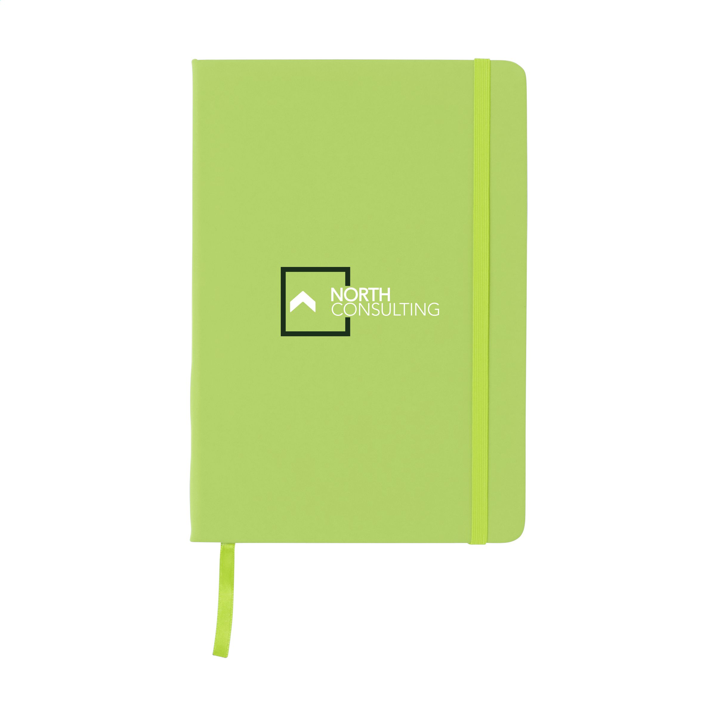 Notizbuch aus PU mit 96 linierten Seiten und einem Cover, welches mit einem Gummiband verschlossen wird. Wenn das Cover gelasert wird, hat das Logo die gleiche Farbe wie das Gummiband.