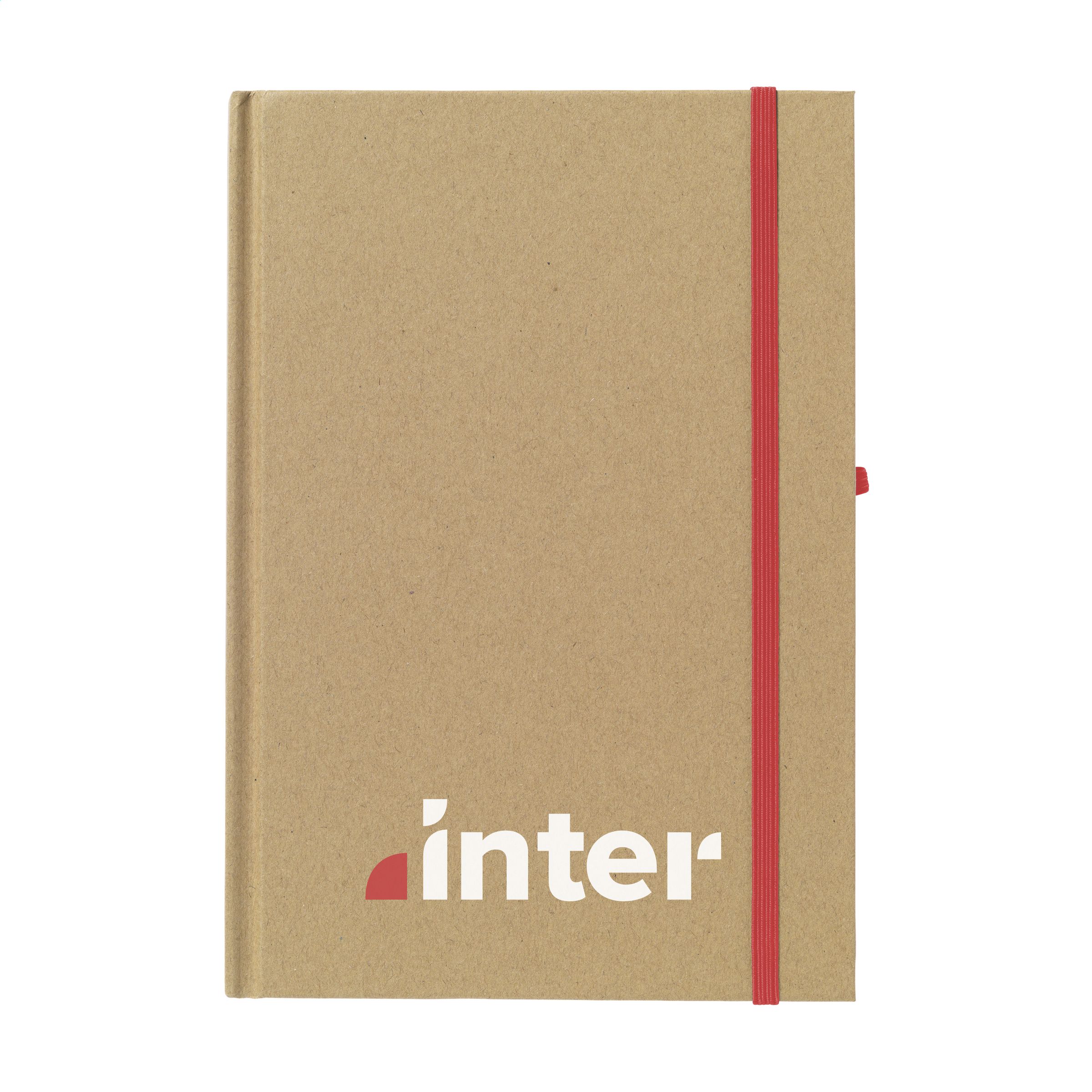 DIN A5 Notizbuch mit gebundenem Soft Cover aus PU. 80 Blatt (160 Seiten) liniertes Recyclingpapier. Kleines Fach im rückwärtigen Umschlag. Elastisches Verschlussband, Lesebändchen und Stifthalter.