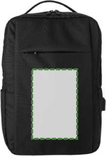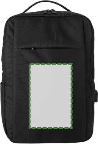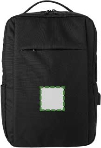 rPET (300D) Laptop (16 Zoll) Rucksack mit 210D Details. Innen mit mehreren Taschen, Laptop-Tasche mit Klettverschluss, eine Fronttasche mit Reißverschluss. Öffnung mit USB-A an der Seite.