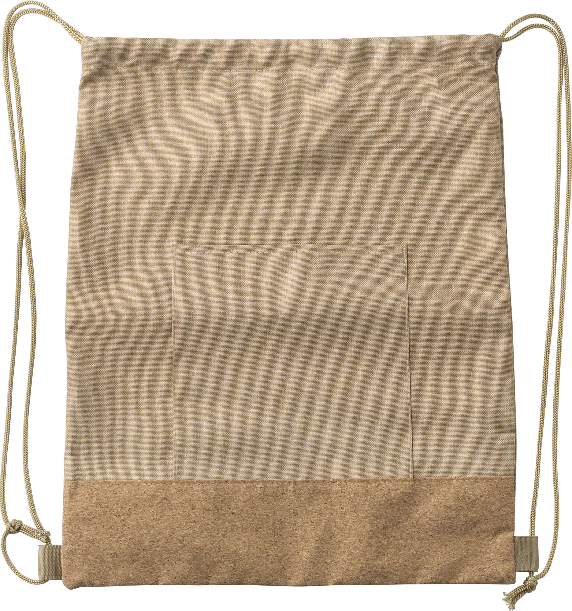 rPET-Polyester (600D) Tasche mit Kordelzug. Boden aus Kork und Naturfarbe. Kleine Tasche auf der Vorderseite. Mit rPET-Etikett.