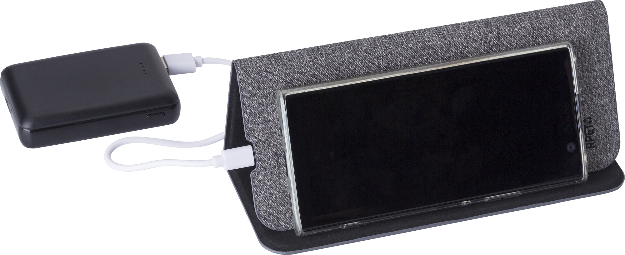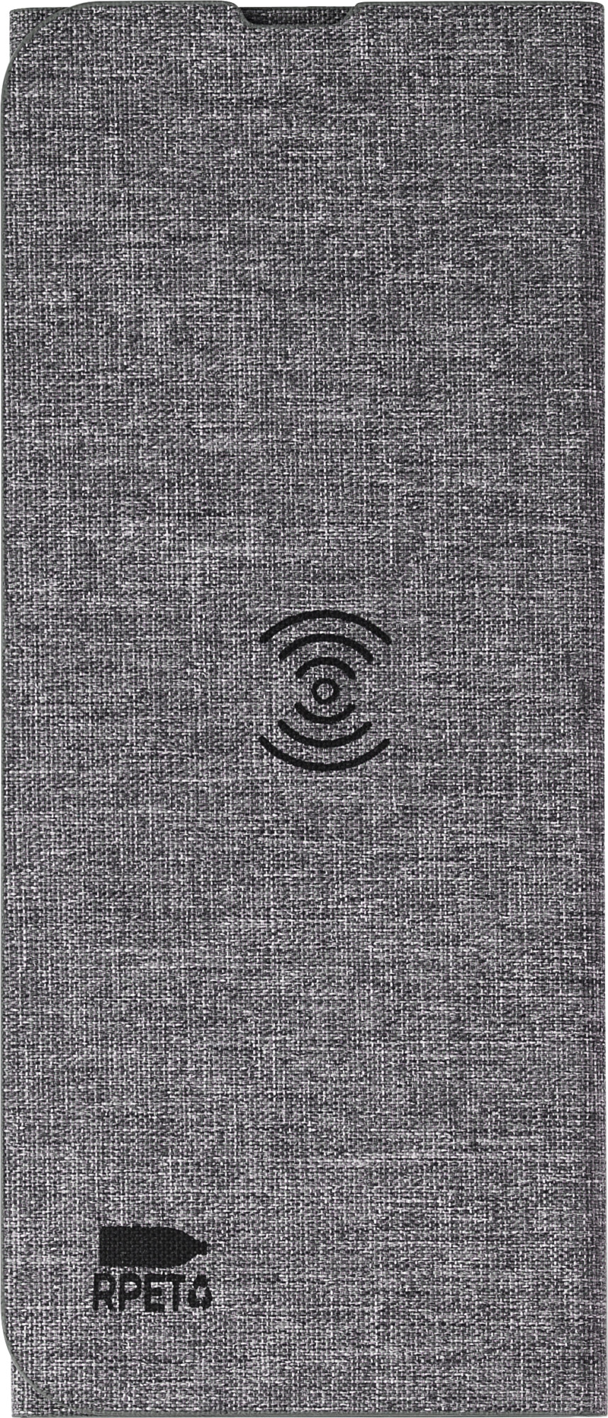 rPET drahtlose Schnell-Ladematte (10W). Zusammenklappbar zur Verwendung als Telefonständer. Verpackt pro Stück in braunem Karton. Mit rPET-Logo.